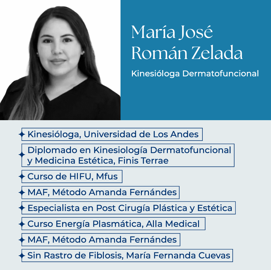 Destacada kinesióloga dermatofuncional, aporta su sólida formación académica y experiencia en tratamientos estéticos y postquirúrgicos. Su enfoque combina técnicas innovadoras como HIFU, manejo de cicatrices y rehabilitación estética, ofreciendo resultados personalizados y naturales que mejoran la calidad de vida de sus pacientes.